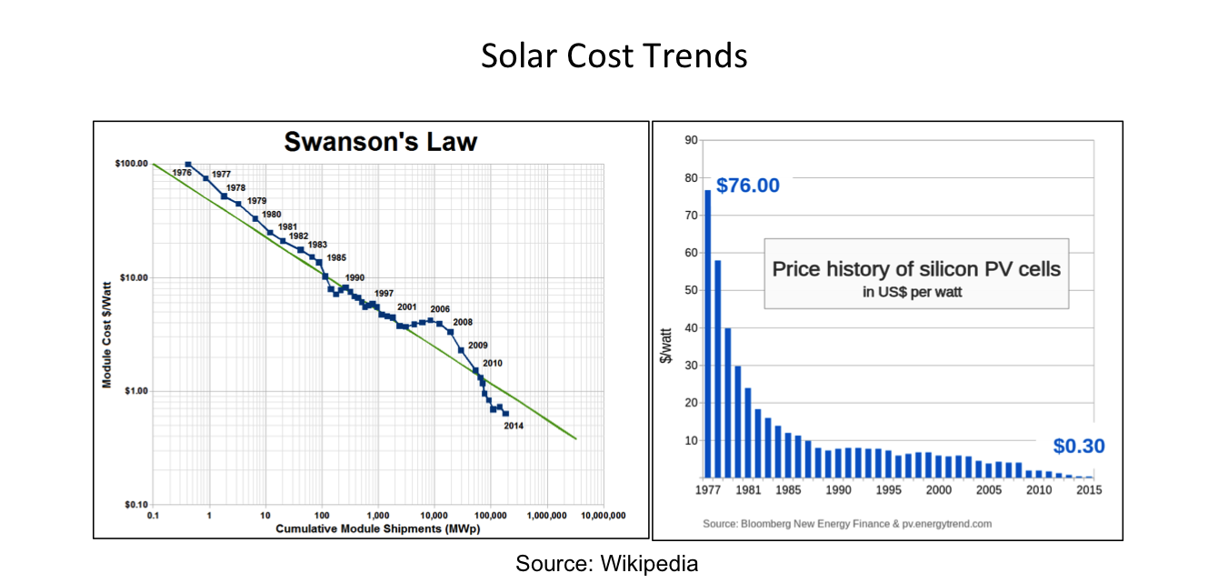The panel on the left shows Swanson’s Law, which states that solar cells drop in price by 20% for every doubling of volume shipped, or about 10% a year since 1980. The panel on the right shows what this means in real terms—solar panels have fallen from a price of $75 per watt to merely $0.30 today.