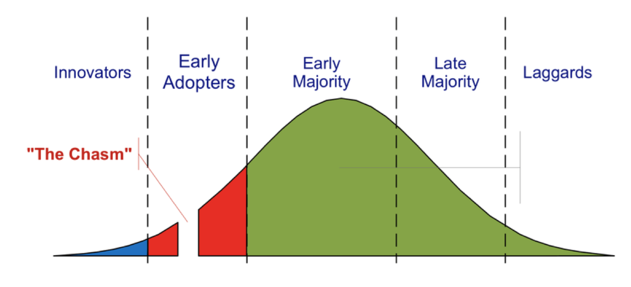 However, in Crossing the Chasm, author Geoffrey Moore pointed out that, while successful ideas do follow the pattern Rogers described, most never make it that far. The problem, he surmised, is that there is a large gap between the mindsets of early adopters and the rest of society, so for a movement to become successful it must adapt itself to the mainstream.