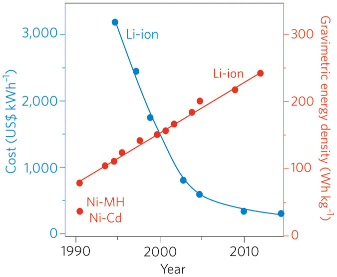 Over the past 25 years, we’ve been able to improve battery performance by modifying or replacing materials to create batteries that operate more efficiently and degrade more slowly. But the dominant factor has been cost, which has fallen by a factor of ten since lithium-ion batteries were introduced.
